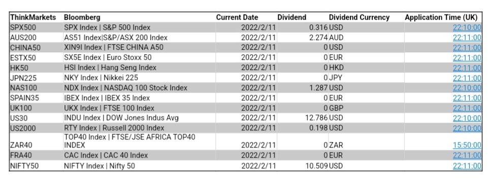 ThinkMarkets智汇平台CFD股指2月11日股息结算明细