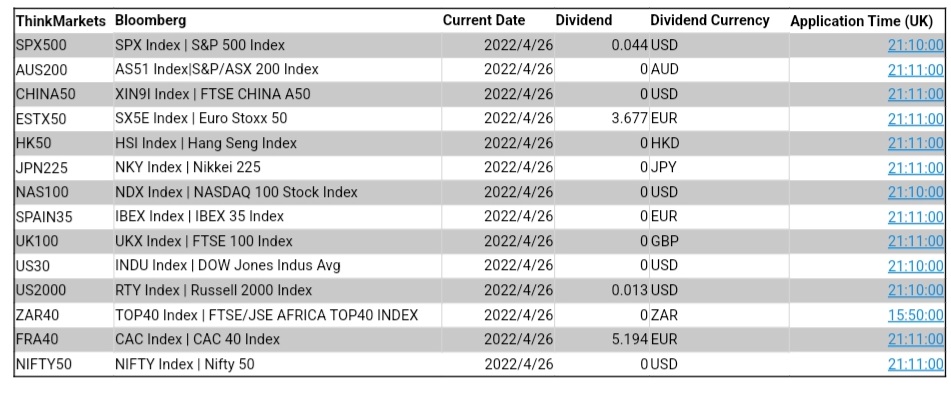 ThinkMarkets智汇平台CFD股指4月26日股息结算明细