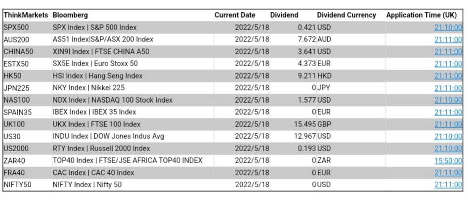 ThinkMarkets 5月18日股指股息结算明细